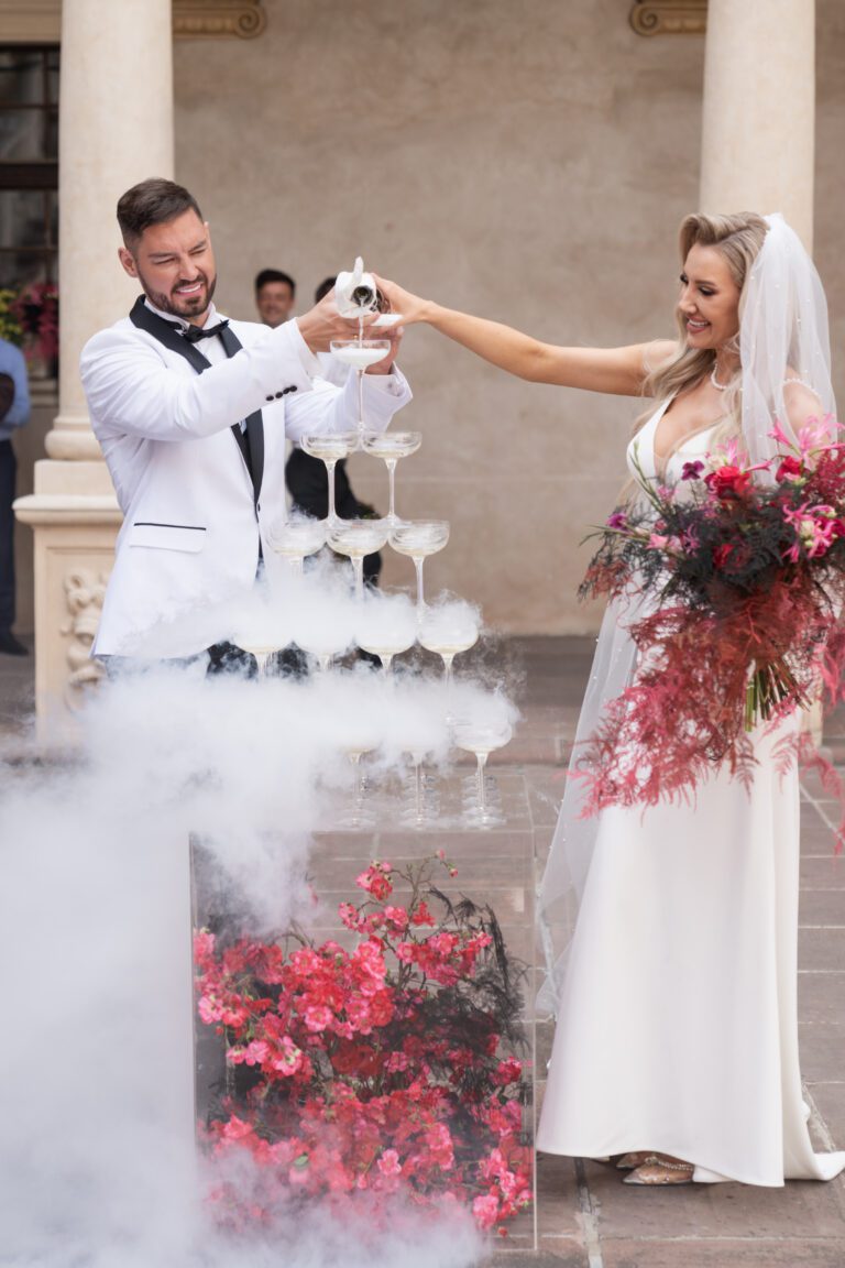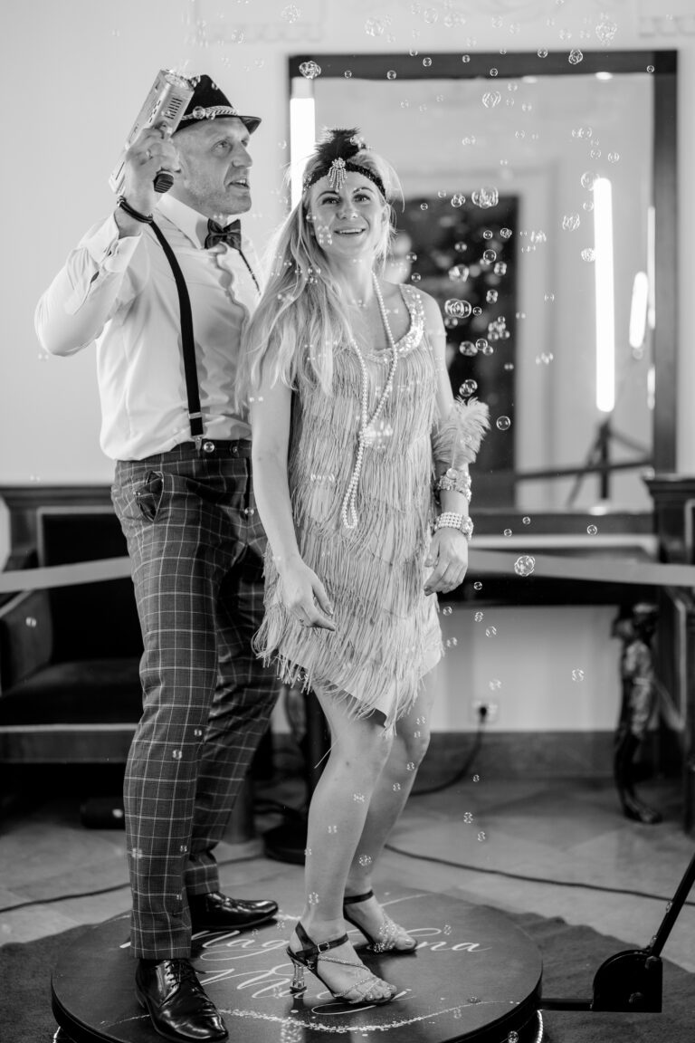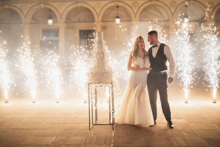 Nadchodziły momenty, które rozświetliły całą uroczystość. Pięciopiętrowy tort z fontannami iskier był nie tylko kulinarnym arcydziełem, ale także spektakularnym punktem wieczoru. Goście byli oczarowani nie tylko smakiem, ale i tym, jak tort wkomponował się w atmosferę pełną elegancji i blasku.