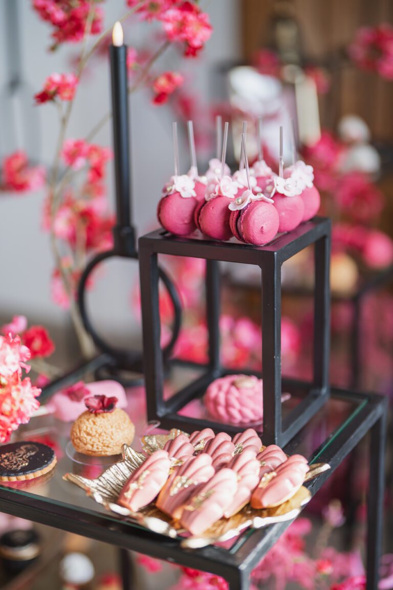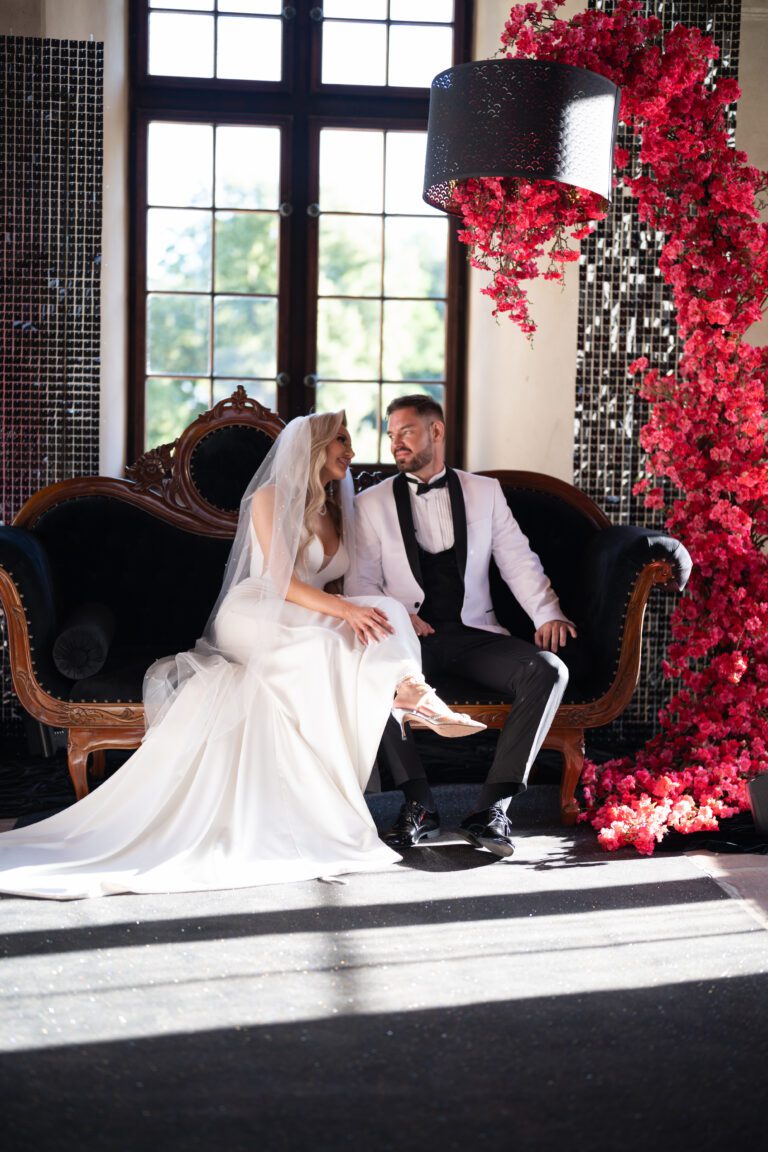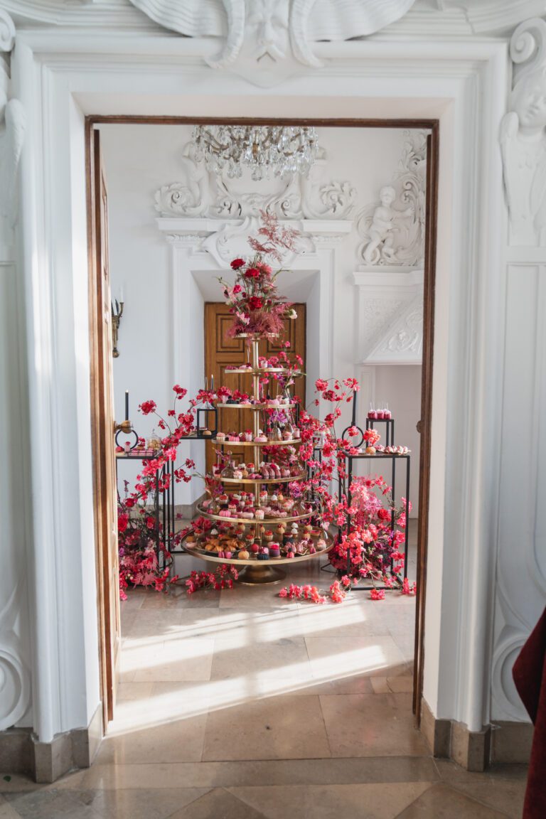 Ceremonia odbyła się w pełnej elegancji, której podkreśleniem była wyjątkowa dekoracja – dominowały głębokie odcienie czerwieni i czerni, z przewagą przepięknych róż. Zamek w Baranowie Sandomierskim stał się idealnym tłem dla tej niezwykłej kompozycji. Słodki kącik, z olbrzymią paterą w centrum, przyciągał uwagę gości, którzy podziwiali staranność wykonania.